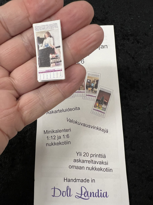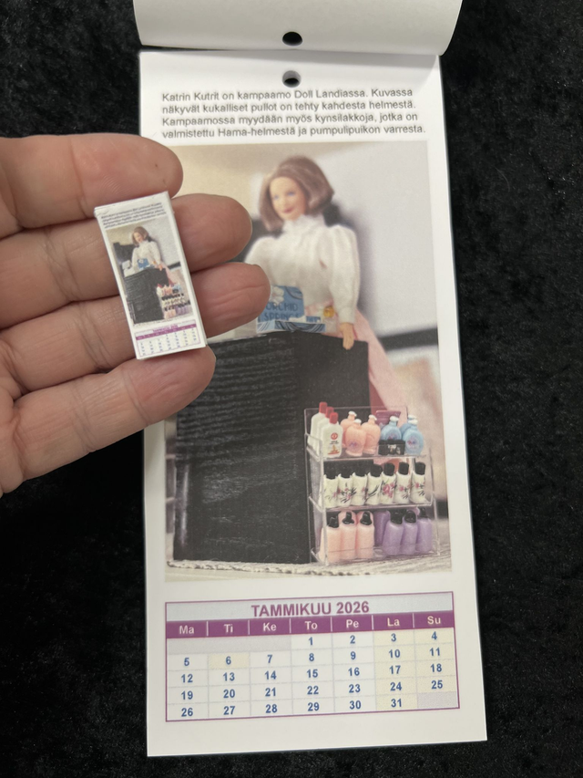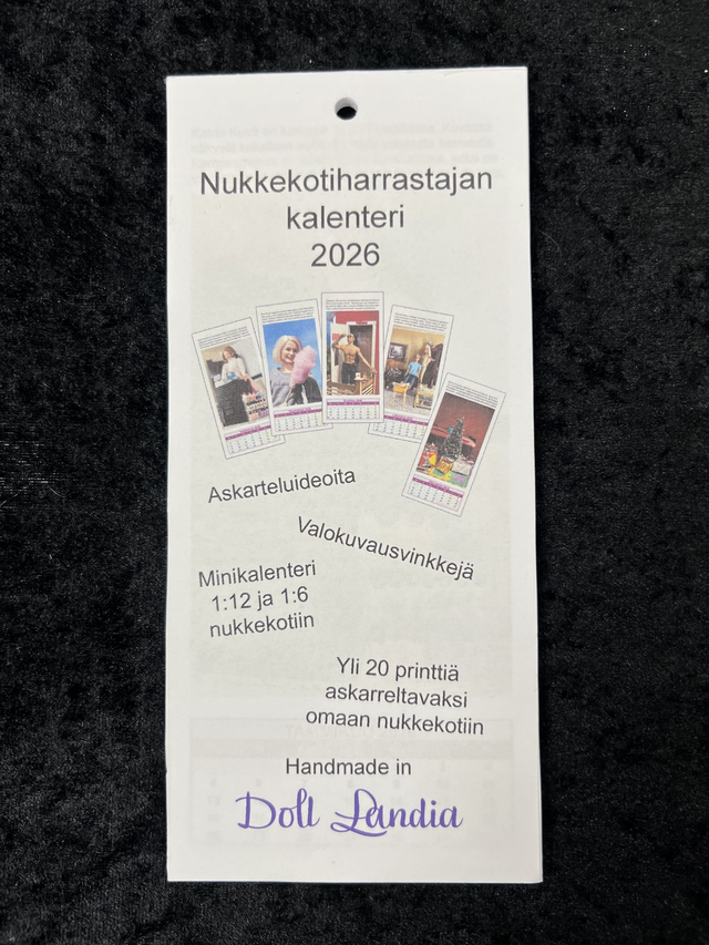 Seinäkalenteri vuodelle 2026 - mainio uutuus ilahduttamaan ideoillaan läpi vuoden. Kuukausien kohdalla olevat kuvat on Doll Landiasta, ja niiden kuvateksteissä kertomassa kuvasta sekä annetaan askarteluideoita tai kerrotaan nukkevalokuvausvinkkejä. Ja mikä parasta, kalenterin lopussa on yli 20 printtiä, joista voit askarrella esineitä omaan nukkekotiisi! Osa esineistä käy kaiken kokoisiin nukkekoteihin, osasta on 1:6 (barbiekoko) ja 1:12 (tavallisin nukkekotikoko) versiot, kuten esimerkiksi tästä kalenterista. Saat siis samalla kaksi (eikun oikeasti kolme!) kalenteria, nukkejen kalenterin sivut voit leikata kalenterin lopusta itse.