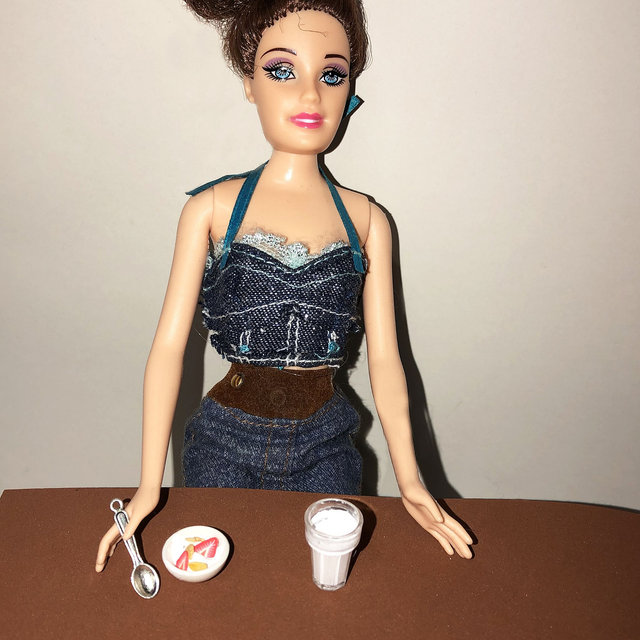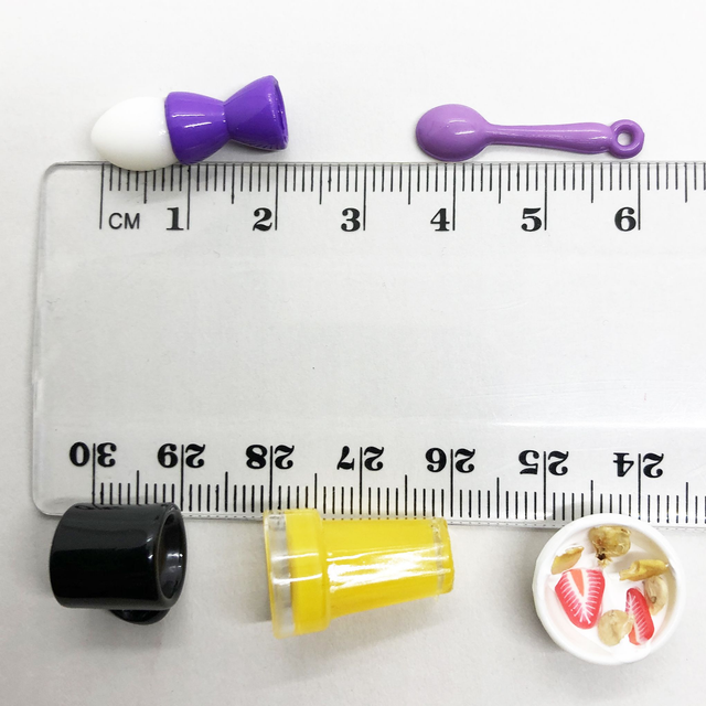 Koko: jogurttikulho halkaisija 1,5 cm, korkeus 0,8 cm, muna kuppeineen korkeus n. 2,0 cm (vaihtelee yksilöittäin +/- 0,1 cm), mehulasi korkeus 1,9 cm, kahvimuki korkeus 1,1 cm ja lusikka pituus 2,5 cm.