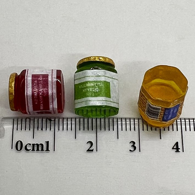 Viiden kuusikulmaisen elintarvikepurkin setti komistamaan nukkekodin hyllyä. Etiketit suunniteltu ja asennettu "Lissun Marjat" ja "Lissun Hunaja" -firmojen tuotteina. Settiin kuuluu mansikka-, kurpitsa- ja puolukkahillo, villiminttuhyytelö sekä hunaja. Purkit eivät aukea.