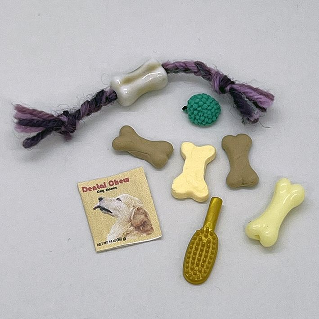 Ilahduta muotinuken koiraa, tai muotinukkea - tai ainakin muotinuken omistajaa - mukavalla kokonaisuudella koiratarvikkeita. Setti sisää puruluita irtona ja pussissa, vinkusiilin, narulelun ja harjan. Yksi puruluu ja harja tehdasvalmisteisia, muut esineet valmistettu käsityönä.