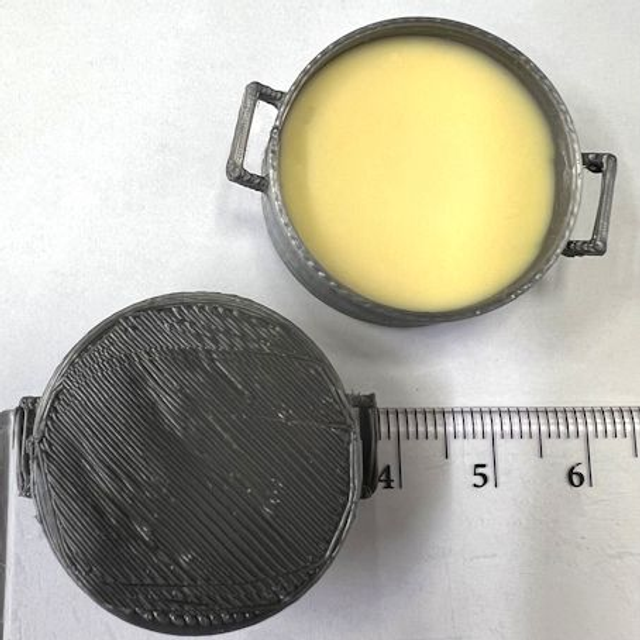 Kattilallinen valmista perunamuussia, samaa mitä löytyy lihapulla-annoksista. Kattila 3D-tulostettu PLA-muovista, muussin määrä vaihtelee annoksen mukaan, koska valmistamme tuotteemme yksin kappalein käsityönä.