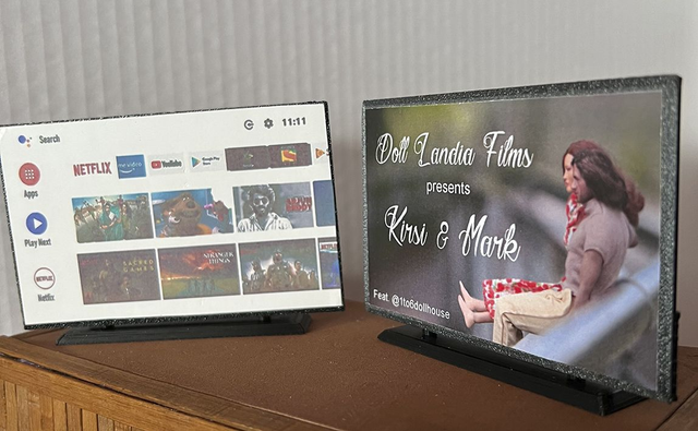 Smart-tv jalustalla tai seinään kiinnitettävänä mallina kaukosäätimen kera. Suunniteltu ja valmistettu 3D-tulostamalla ja kuva printaten Joutsan Havumäessä. Kukkasen Puodin omaa 1to6ware -tuotemerkkiä, koottu käsityönä. Valitse kumman kuvan haluat televisiosi näyttöön, Smart-valikon vaiko elokuvan alkutekstit.